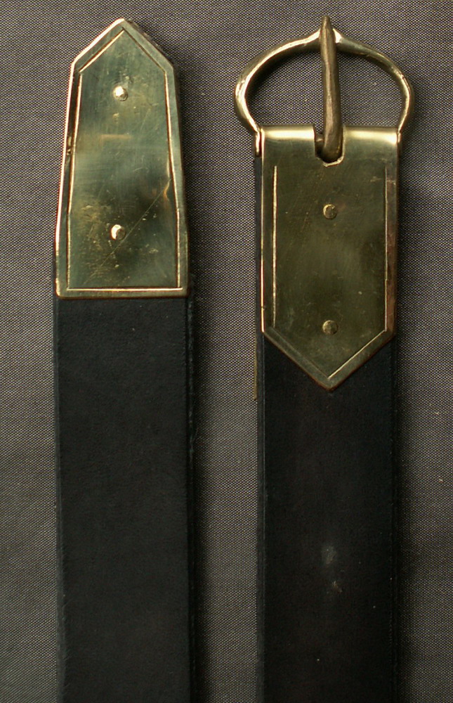This is a medieval style belt with an oak gall glack 7/8 inch (22mm) wide strap. It is 61 inches (155cm) long with a hand made brass buckle plate and strap end. This style of buckle was in common use from 1350 - 1450