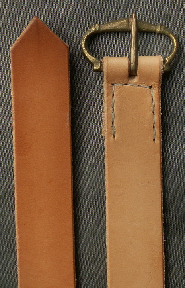 This is a medieval style belt with a tan 7/8 inch (22mm) wide strap. It is 55 inches (140cm) long with a hand made brass buckle plate and strap end. This style of buckle was in common use from 1300 - 1500.
