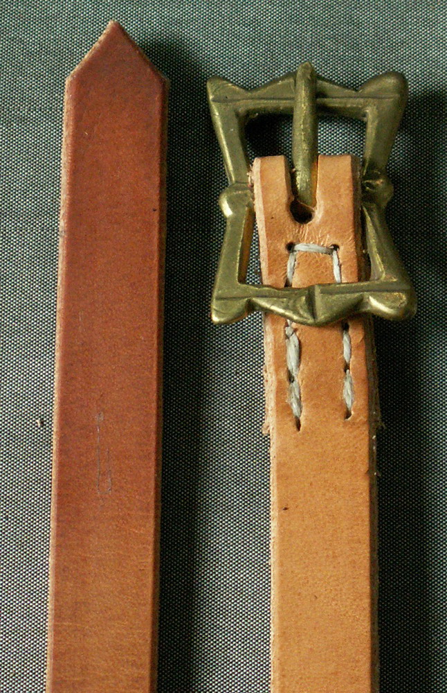 This is a stuart style belt with a tan 3/8 inch (10mm) wide strap. It is 53 inches (135cm) long. This style of buckle was in common use from 1620 - 1680