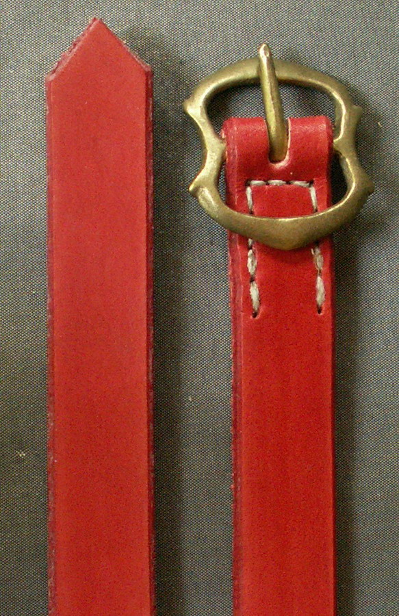 This is a tudor/stuart style belt with a brazilwood red 5/8 inch (16mm) wide strap. It is 50 inches (127cm) long. This style of buckle was in common use from 1500 - 1650