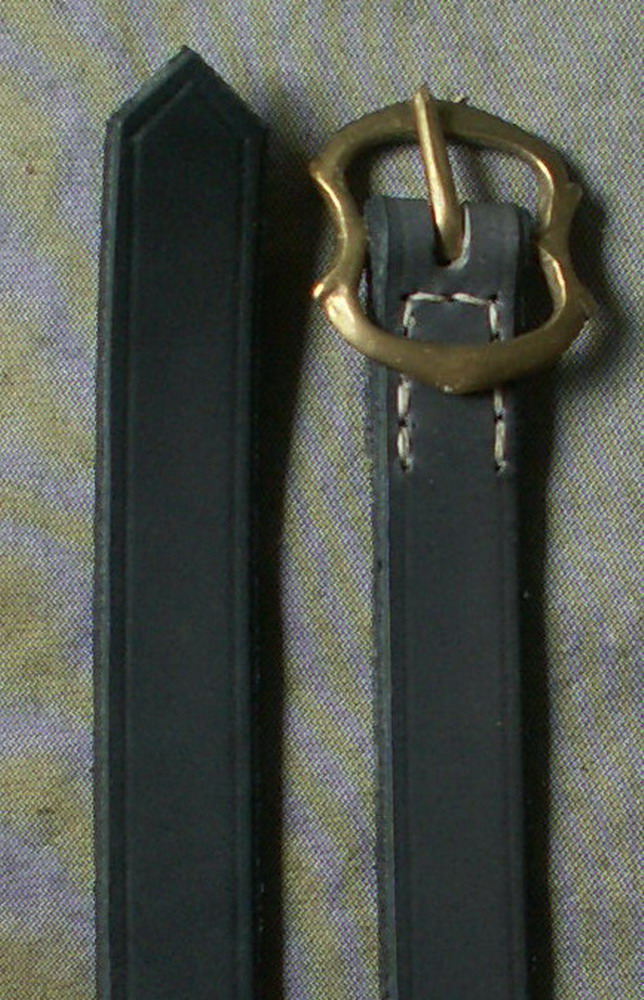 This is a tudor/stuart style belt with a oak gall black 5/8 inch (16mm) wide strap. It is 57 inches (145cm) long. This style of buckle was in common use from 1500 - 1650