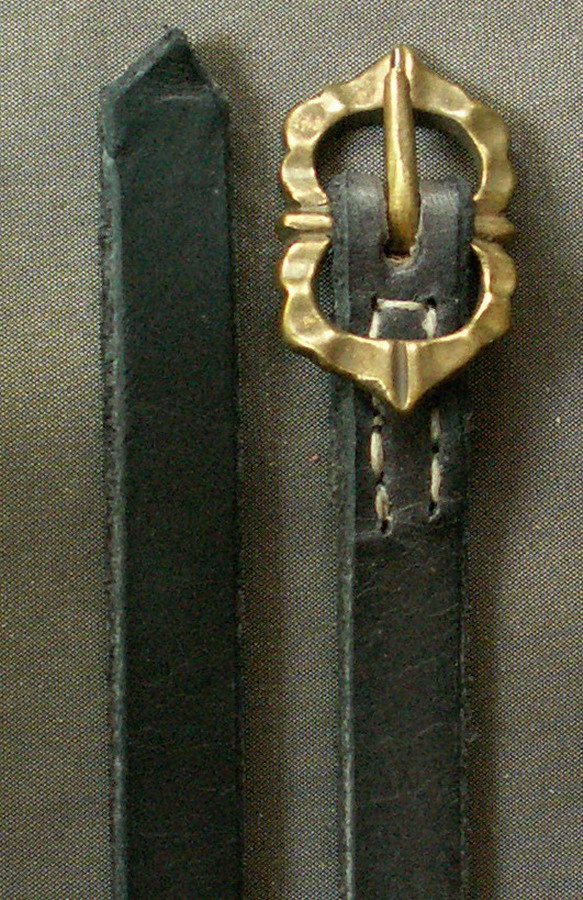 This is a tudor/stuart style belt with an oak gall black 1/2 inch (11mm) wide strap. It is 54 inches (138cm) long. This style of buckle was in common use from 1550 - 1650