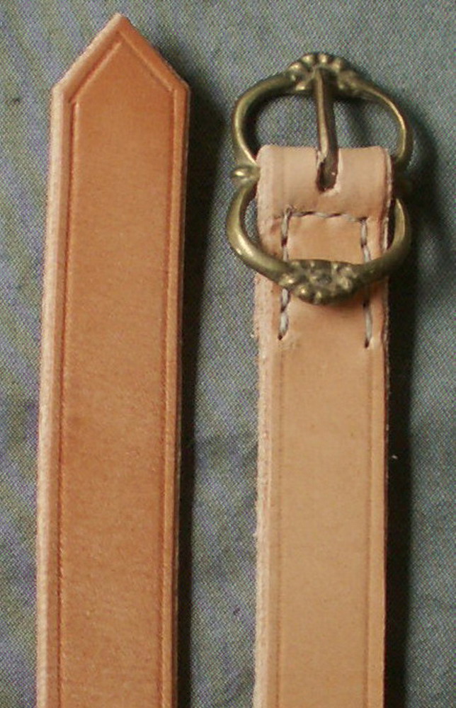 This is a tudor/stuart style belt with a tan 3/4 inch (19mm) wide strap. It is 62 inches (157cm) long. This style of buckle was in common use from 1550 - 1650