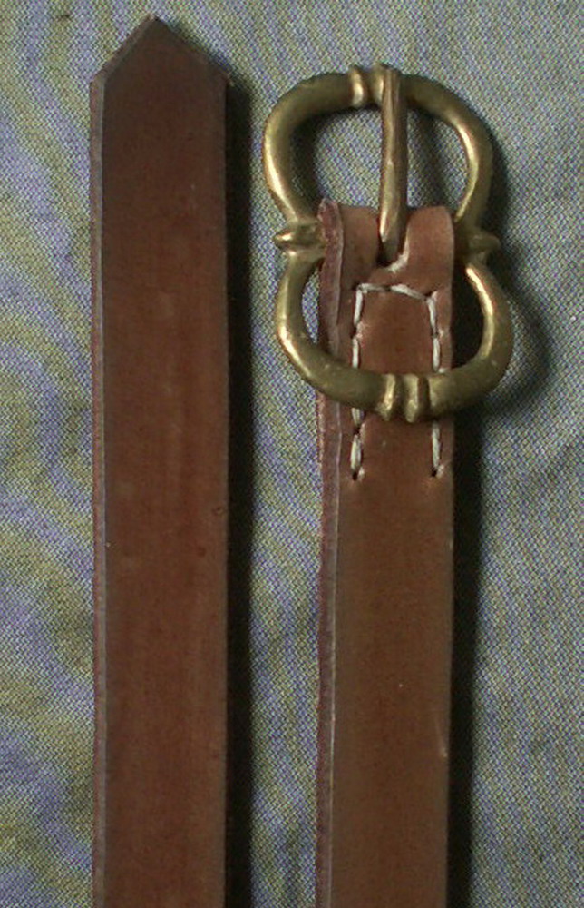 This is a tudor/stuart style belt with an brown 5/8 inch (16mm) wide strap. It is 60 inches (152cm) long. This style of buckle was in common use from 1550 - 1650