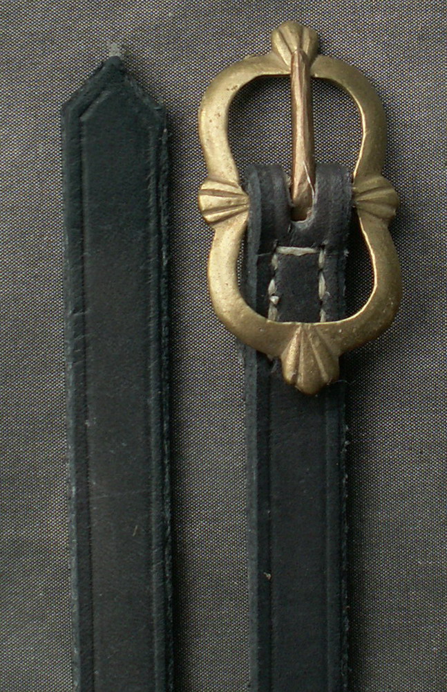 This is a tudor/stuart style belt with an oak gall black 1/2 inch (12mm) wide strap. It is 54 inches (137cm) long. This style of buckle was in common use from 1550 - 1650