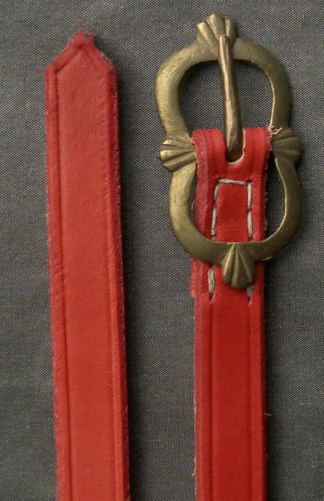 This is a tudor/stuart style belt with a brazilwood red 1/2 inch (16mm) wide strap. It is 54 inches (137cm) long. This style of buckle was in common use from 1550 - 1650