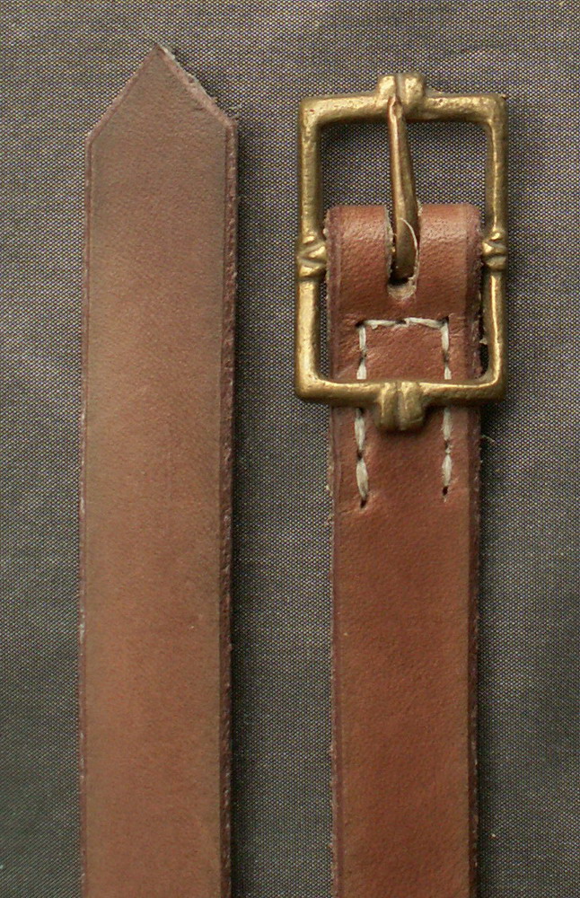 This is a tudor/stuart style belt with a brown 5/8 inch (15mm) wide strap. It is 56 inches (142cm) long. This style of buckle was in common use from 1600 - 1700