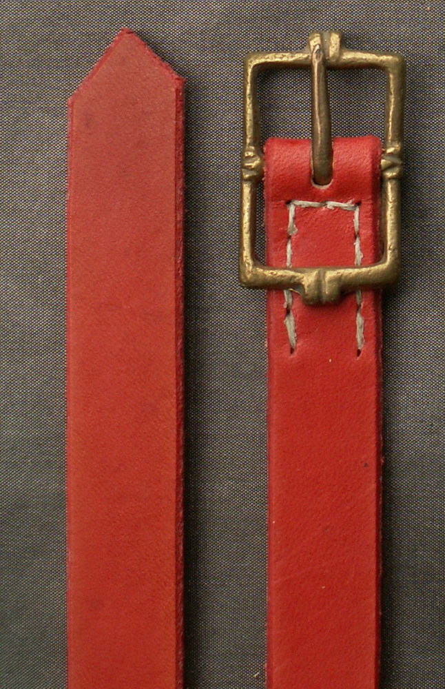This is a tudor/stuart style belt with a brazilwood red 5/8 inch (15mm) wide strap. It is 56 inches (142cm) long. This style of buckle was in common use from 1600 - 1700
