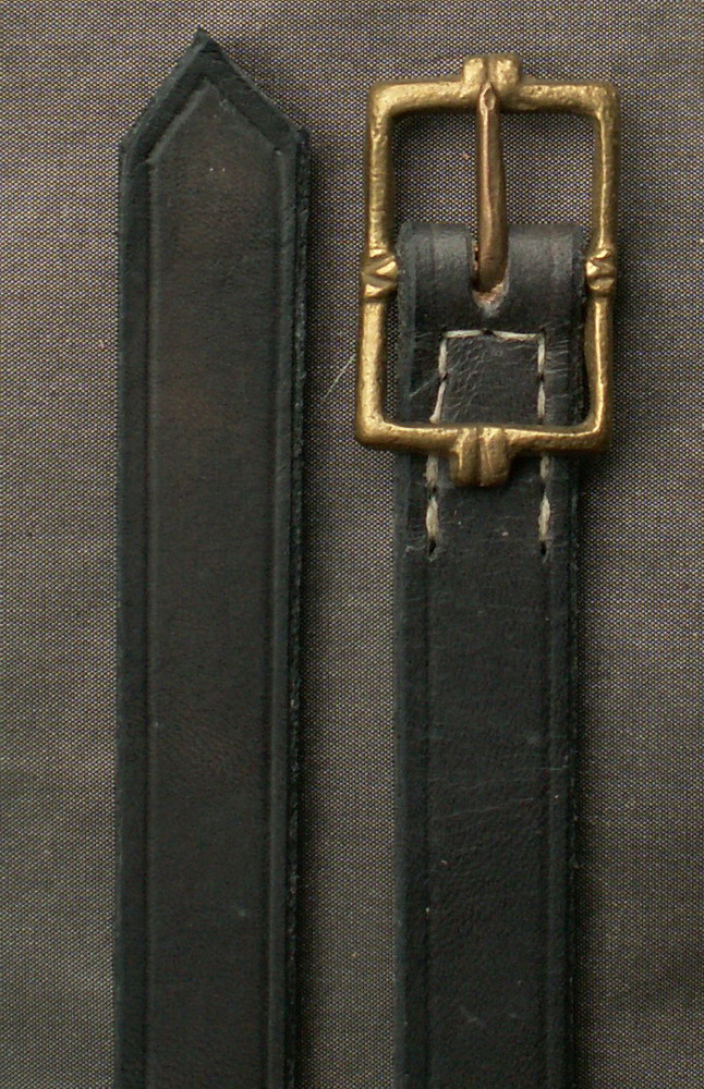 This is a tudor/stuart style belt with a oak gall black 5/8 inch (15mm) wide strap. It is 56 inches (143cm) long. This style of buckle was in common use from 1600 - 1700